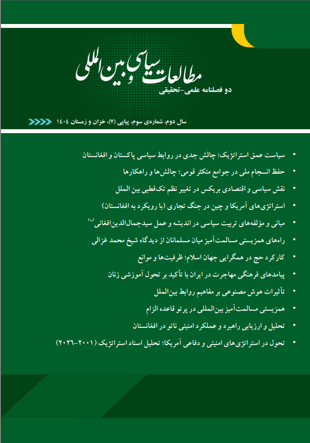 فصلنامه مطالعات سیاسی و بینالمللی مربوط به دانشگاه خاتمالنبیین(ص) افغانستان است. دانشگاه خاتمالنبیین(ص)؛ صاحب امتیاز فصلنامه بوده و این فصلنامه تحقیقات علمی و مقالات علمی دانشکده علوم سیاسی و دیپارتمنت روابط بینالملل را به نشر می سپارد. تا کنون شمارههای متعددی از این فصلنامه تحت عنوان مجله علمی _ پژوهشی علوم سیاسی به صورت فیزیکی به نشر رسیده و در سایت دانشگاه نیز بارگزاری شده است. تلاش میشود از این پس با توجه به همه معیارهای علمی و آکادمیک این مسیر در عرصه دانش تخصصی علوم سیاسی و روابط بینالملل ادامه یابد. هر چند این فصلنامه تلاش میکند تا نتایج و یافتههای تحقیقی در حوزه تخصصی علوم سیاسی و روابط بینالملل را انتشار دهد، اما اولویت فعالیت نشراتی این فصلنامه مقالات و تحقیقات سیاسی و بینالمللی ناظر به افغانستان، منطقه و جهان اسلامی میباشد. دسترسی آزاد محققان به نسخه الکترونیکی فصلنامه، فرصت ارزشمندی است که رابطه لازم میان نویسندگان و فصلنامه را گسترش می بخشد. توسعه و انکشاف دانش سیاسی و بینالمللی و حمایت از تحقیقات تخصصی در حوزه علوم سیاسی و روابط بینالمللی از مهمترین اهداف تأسیس و نشر این فصلنامه علمی است. انتظار میرود این فصلنامه بستر مساعد و همواری را برای گسترش دانش سیاسی و بینالمللی و ترویج تحقیقات علمی در این زمینه را فراهم نموده و جهت فراهم سازی بستر انکشاف و توسعه نظریه پردازی در عرصه علوم سیاسی و روابط بینالملل نقش مثبت و سازندهای را ایفاء نماید.
